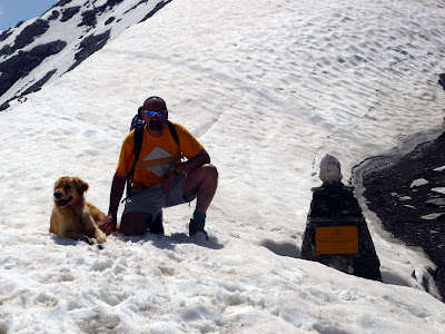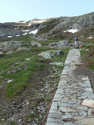 Dopo pochi passi in discesa, stavolta seguendo la strada reale, in modo da compiere un percorso ad anello ed evitare il nevaio che a quest'ora comincia a mollare, sentiamo sopra di noi dei rumori di rocce smosse.