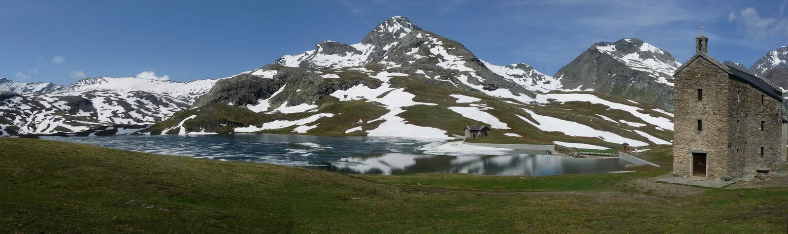In breve arriviamo a quota 2.580m sul pianoro che ospita lo splendido ed ancora parzialmente ghiacciato Lago Miserin con l'omonimo rifugio e il santuario di Notre Dame de Neige, ricostruito nel 1880 ma originario del 1600.